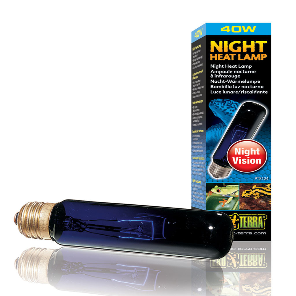 The Exo Terra Night Heat Lamp bulb simulates natural moonlight to allow nocturnal viewing without disturbing the animal's day and night cycle. The light emitted is bluish due to the use of blue glass. The heat generated by the bulb is minimal but enough to provide tropical night time temperatures. The lower Watt of these bulbs does not interfere with natural night drops in temperature.